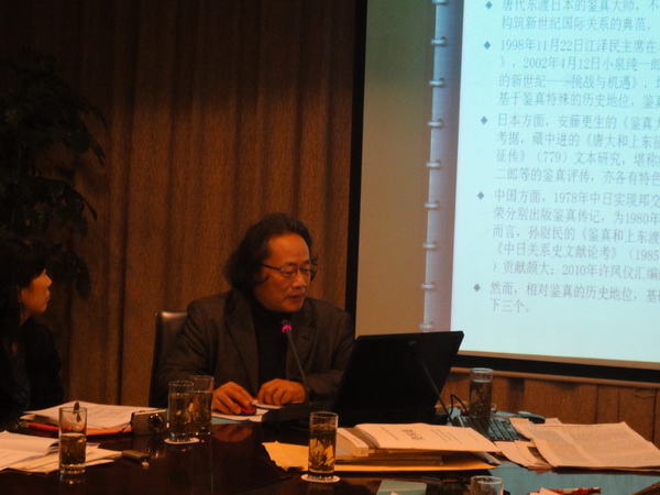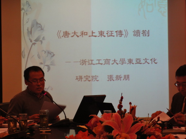 浙江工商大学的张新朋副教授发表的题目为“《唐大和上东征传》读札”。发表中张博士指出:汪向荣先生于1979年出版的校注本《唐大和上东征传》因时代和资料的限制,在标点、注释上存在欠妥之处。本次通过研读日本东寺观智院所藏的两个抄本、高山寺藏本、《群书类从》和《大日本佛教全书》以及《大正新修大藏经》的所收本,从“校勘”和“句读”两个方面对上述的汪氏本提出了若干修正意见,得到了与会代表的首肯。