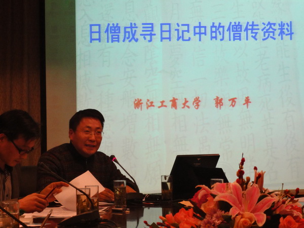 浙江工商大学的郭万平副教授发表的题目是“日僧成寻日记中的僧传资料”。郭老师在发表中,重点介绍了成寻日记《参天台五台山记》中出现的译经僧、感通僧以及力游僧的概况,利用成寻的日记对中国的相关历史记载进行了补充和校正,从而对《参天台五台山记》的价值予以了充分肯定。最后,郭老师还对中日《高僧传》的异同进行了说明。