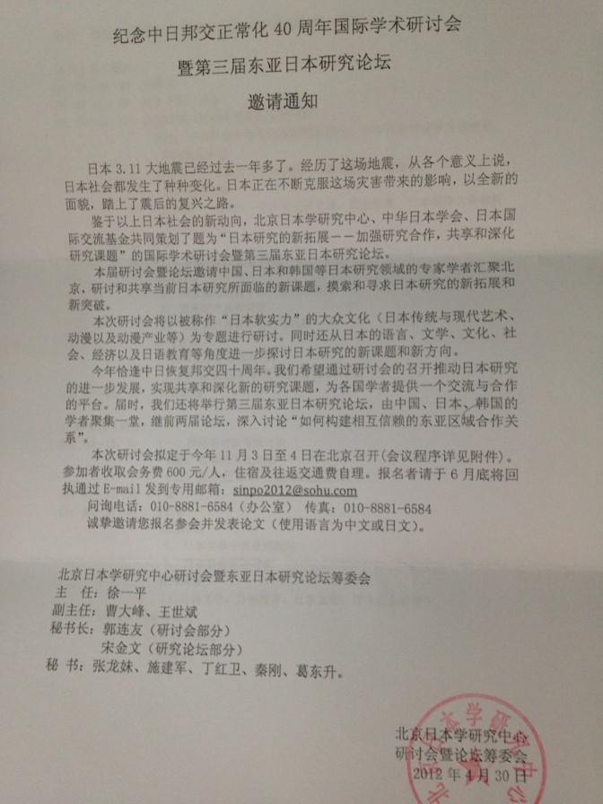 北京日本学研究中心 纪念中日邦交正常化40周年国际学术研讨会通知