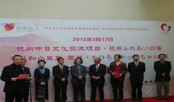 2012年3月17日下午,由日本国际交流基金会、日本知弘美术馆、杭州图书馆主办的中日文化交流项目暨“千弘和小豆豆”画展,在杭州市图书馆盛大开幕。我原院长王勇教授(右起第5)应邀出席开幕式。日本国前驻华特命全权大使、现任日本国际交流基金会日中交流中心所长的阿南惟茂先生亲莅现场,并用中文发表了热情洋溢的开幕致辞。开幕式由杭州市文广局局长孙建一先生主持,翻译由浙江工商大学日语学院的吴玲老师担任。出席开幕式的有杭州图书馆馆长、杭州市外办负责人、日本驻上海领事馆首席领事、日本驻青岛领事馆首席领事、知弘美术馆负责人以及日本国际交流基金会日中交流中心办公室主任等。