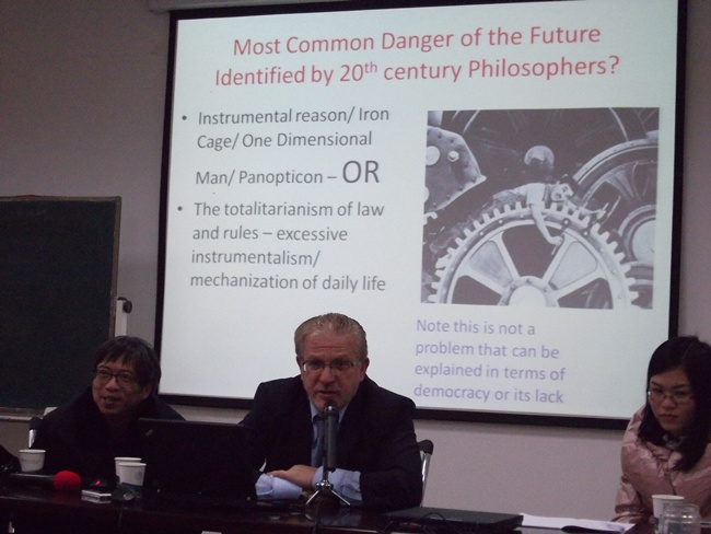 Wayne Cristaudo博士极富创意地以一曲欢快的吉他弹唱开始了讲座,以其跨越历史、哲学、文化、宗教等学科领域广泛的广泛知识,配以详尽的实际案例列举,以伊斯兰国家为参照,Wayne Cristaudo博士指出了中国和西方发达国家在部分基础价值取向上的兼容性以及历史发展轨迹的相似性等许多实质性的共同特点。同时,他还在讲座上剖析了西方自由民主主义在现今阶段的局限性,指出了西方式的民主制度的缺陷和矛盾,强调了“公民社会建设”在中国今后发展中所能发挥的关键作用。